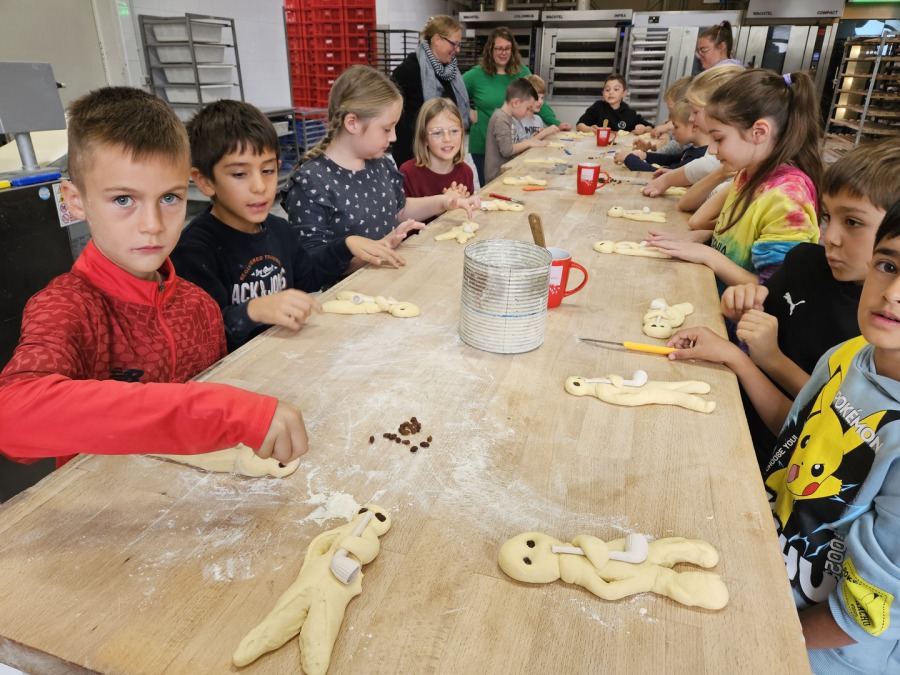 Ein besonderes Highlight des Vormittags war das eigene Backen: Unter Anleitung des Bäckers durfte jedes Kind einen Weckmann aus Hefeteig formen. Mit viel Begeisterung entstanden so viele kleine